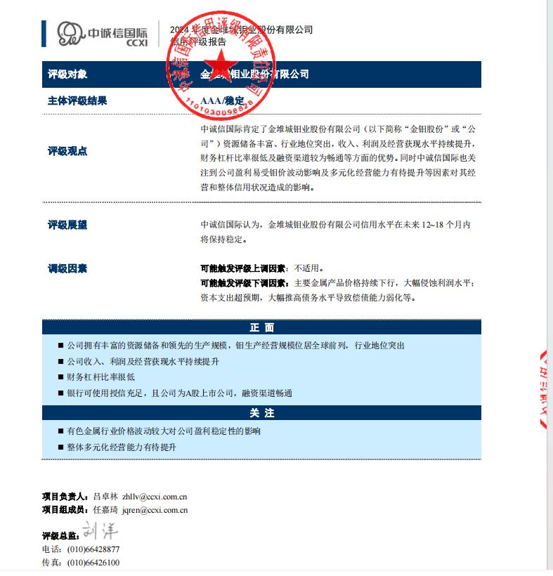 近日,金堆城钼业股份有限公司荣获国内权威信用评级机构中诚信国际信用评级有限责任公司AAA主体信用评级。这是ty8天游平台登录股份首次参与外部评级,并获得主体信用评级AAA的最高等级。