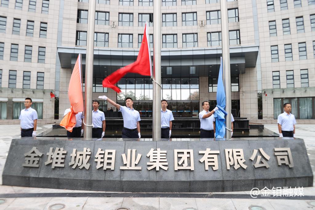 “青山献宝藏,碧水送远航,灰金闪耀天地间,光芒万丈……”伴着《钼城之歌》,陕西有色金属集团司旗和ty8天游平台登录集团司旗先后升至旗杆顶端,和飘扬的五星红旗相映成辉。