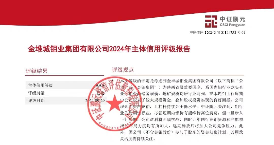 “AAA”级主体信用评级是目前国内企业信用评级中的最高等级,获得这一评级,不仅是对公司综合实力、经营管理水平以及信用状况的高度认可,更是对公司行业地位、生产经营、风险控制、公司治理等方面的中肯评价。ty8天游平台登录集团致力于深耕钼钒产业,积极谋划布局战新产业,坚持“12345”发展战略,注重稳健经营,特别是钼产业生产规模领先,行业地位突出,产业链条完整,成本控制水平高。同时,公司还建立了完善的风险防控体系,积极履行社会责任,治理结构和内控制度较为完善,整体ESG表现良好,在陕西有色金属集团具有重要的战略定位。